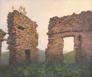 Since the last newsletter, I also completed some commissioned paintings, including a 60 x 72 inch painting, "The Great Weight of Melancholy", which - obviously - will not be in the show. "Melancholy" depicts the surviving ruins of an abbey in the South of France where I painted a 9 x 10 inch oil of the same subject. The title comes from author Guy de Maupassant's description of this windswept abbey when he traveled to it in the late 19th century. A collector in Manhattan purchased the small work, and then commissioned me to paint the much larger version. Another private commission recently completed was "Mimi's Garden".