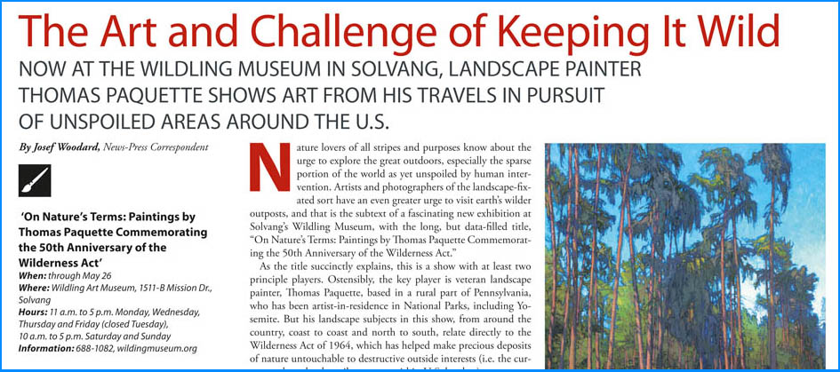 First news is, the exhibition closing date for On Nature's Terms: Paintings by Thomas Paquette commemorating the 50th anniversary of the Wilderness Act at the Wildling Museum in Solvang, CA, has been pushed back almost two months.