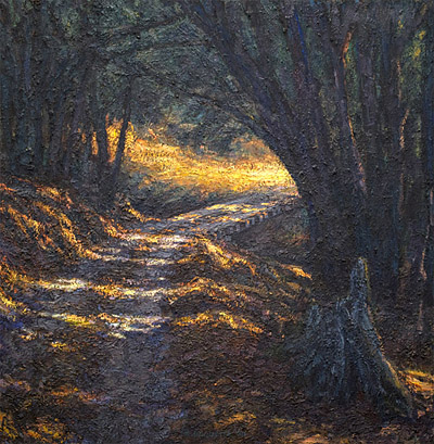"Fox Creek Crossing" is a large painting and among my thickest. Like my other paintings from that time, the paint probably averages more than half an inch thick over its more-than five-foot by five-foot surface. (More than a cubic foot of solid paint.) It is a key work from that period, and I am very happy that Areta decided to donate it to the EAM (a museum not far from me), for the public good.