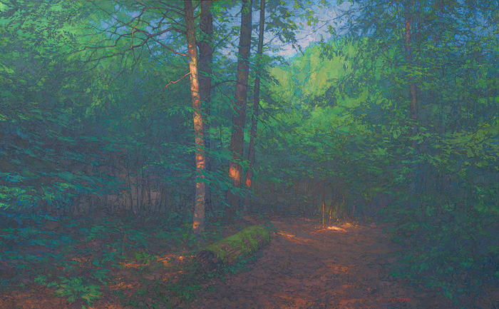 That one painting, above, is the first major piece to be released from my studio in too long. Ironwood Trail [46 x 74 inches, oil on linen] is titled after a trail in my local woodland, the Allegheny National Forest. [Click on image for link.] The extended news about this work is that you can see it in Ohio at the Butler Institute of American Art starting July 18 through September 5, in their annual national juried exhibition.