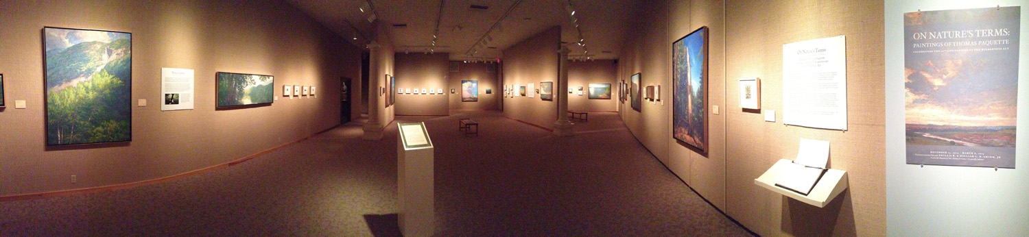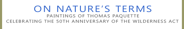 Thomas Paquette's paintings in On Nature's Terms were inspired by his journeys to federal wilderness areas all across the country. The great diversity and vitality of environments that comprise the National Wilderness Preservation System from southwest canyons and high peaks, east and west seashores, to lowland swamps and deserts are reflected in these gouache and oil paintings.. Subjects include Okefenokee Swamp in the south to Boundary Waters Canoe Area in the north, and other wilderness areas from New Hampshire to California, including places in Arizona, Colorado, Georgia, Nevada, New Mexico, North Dakota, Pennsylvania, Utah, and Wyoming.